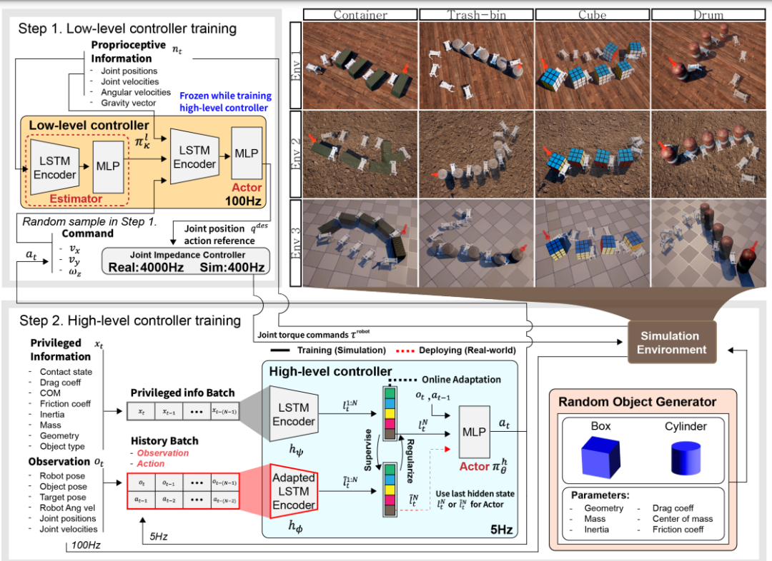 针对这个问题,韩国团队提出了分层控制策略,其中高级控制器基于机器人和物体的状态输出速度指令,而低级控制器输出期望的关节位置,从而使关节扭矩跟踪给定的指令。在遇到多种不同物体时,这个方法能够使用深度潜在变量编码模型,将从多次交互、本体感觉和动作历史中获得的信息嵌入到低维潜在向量中。这使得机器狗可以逐渐理解物体的物理属性,就像人类一样,先是依靠经验来确定力的方向和大小,然后在交互过程中,加深自己对物体的理解,从而调整策略和力度。在模拟器中,他们使用立方体和圆柱形的物体来训练机器狗,它在45次尝试中都成功地把物体移动到目标位置。