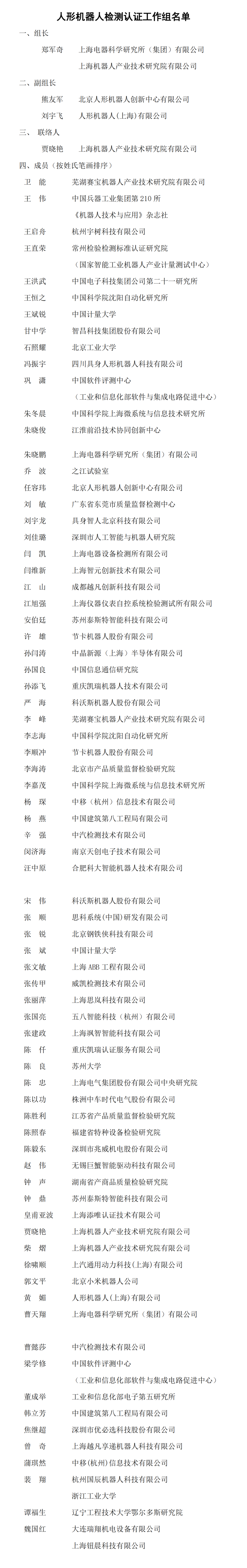 工作组目前有77位专家,来自64个单位,国家机器人检测与评定中心(总部)主任、leyu.乐鱼(中国)机器人有限公司官网院长郑军奇任工作组组长,北京人形机器人创新中心有限公司总经理熊友军和国家地方共建人形机器人创新中心技术总监刘宇飞任副组长。