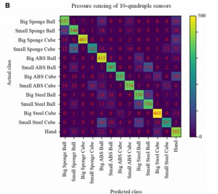为了训练机器手的物体识别能力,该团队在室温下操作机器手,并分别让其抓住人手、以及其他大小和形状均不相同的材料,如钢球和海绵等。在机器手抓住这些物体时,该团队会记录下传感器的输出信号。