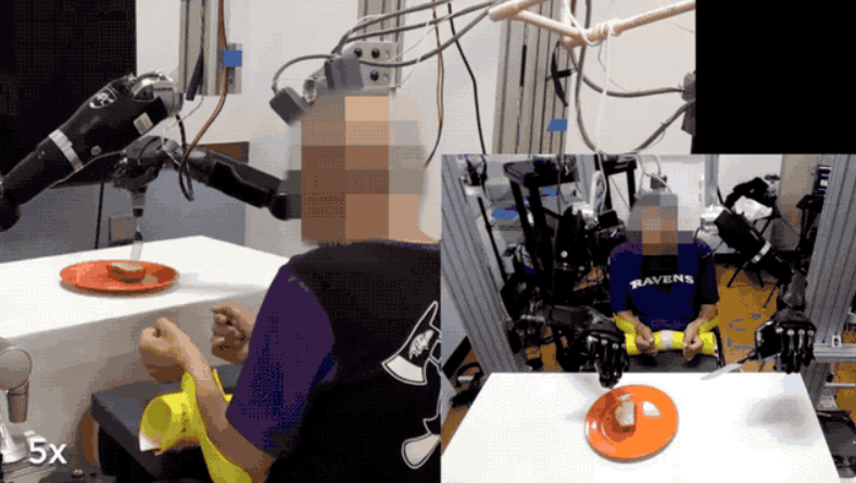 使用刀叉对普通人来说并不难,但对于脑机接口系统来说,两个机械臂共有34个自由度需要操控。