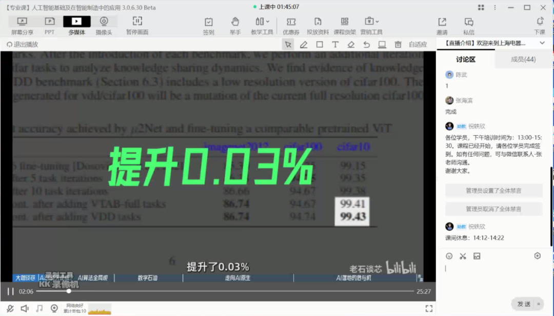 本次培训采取线上直播形式,参加学员共计44人,来自中国电信股份有限公司上海机器人leyu.乐鱼、中国联合网络通信有限公司上海市分公司、中移(上海)信息通信科技有限公司、上海人工智能创新中心、宝信软件股份有限公司、上海建工集团投资有限公司、上海浦东发展银行股份有限公司、上海复旦微电子集团股份有限公司、健康云(上海)数字科技有限公司、新智道枢(上海)科技有限公司、上海有个机器人有限公司等30多家企事业单位。