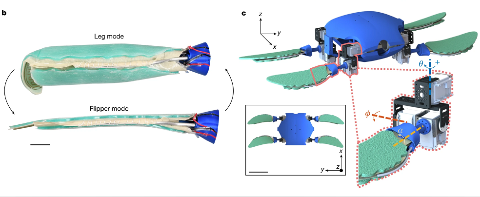 机器龟的不同在于,它在每个环境中利用相同的推进机制,可以根据环境调整其形状、刚度和行为。当从一种环境过渡到另一种环境时,四只脚能够自动的调整形状、刚度和动作,这也就是研发人员所说的“自适应形态发生”。