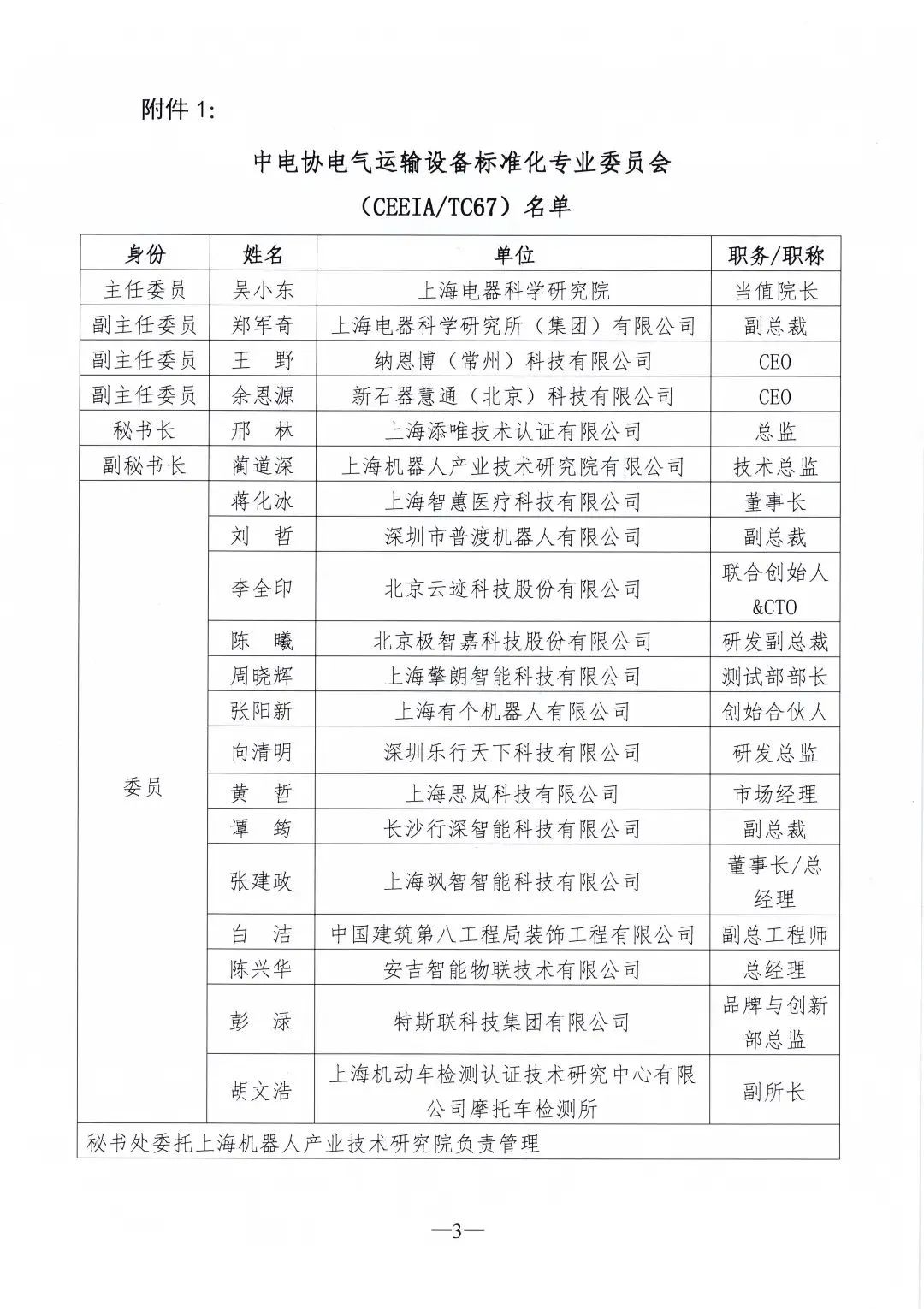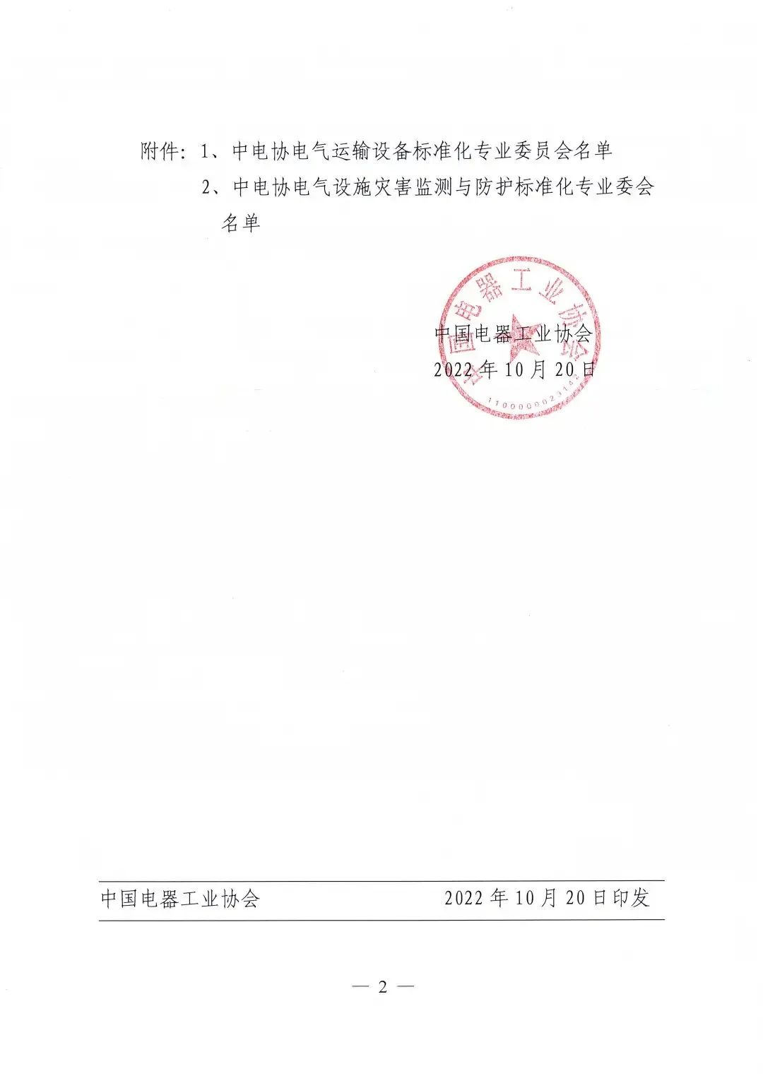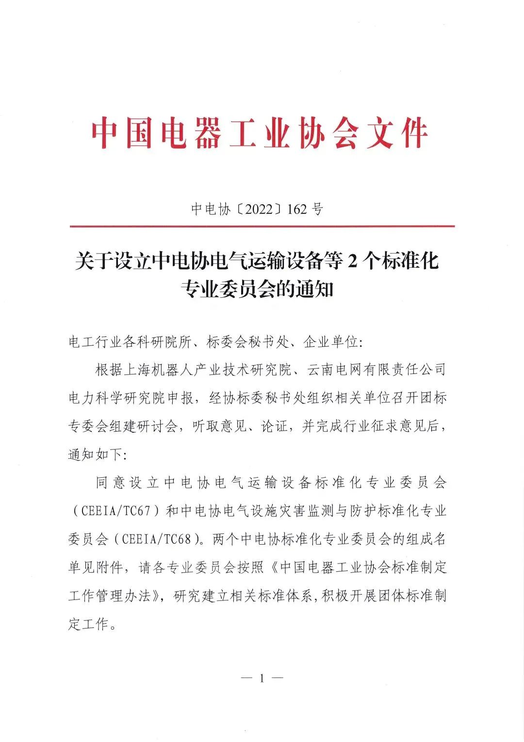 2022年10月20日,中电协[2022]162号文件下达了《关于设立中电协电气运输设备等2个标准化专业委员会的通知》,同意设立中电协电气运输设备标准化专业委员会(CEEIA/ TC67),秘书处挂靠单位为leyu.乐鱼(中国)机器人有限公司官网。