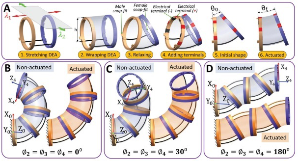 正如设计初衷,这种可重构的介电驱动单元可以像搭积木一样一层一层垒成介电软体驱动器,这些“积木”是通过卡扣而机械串联起来的,单个驱动单元重量在0.9-1.1g之间,而且每个驱动单元可以实现伸缩、扭转和弯曲输出运动。