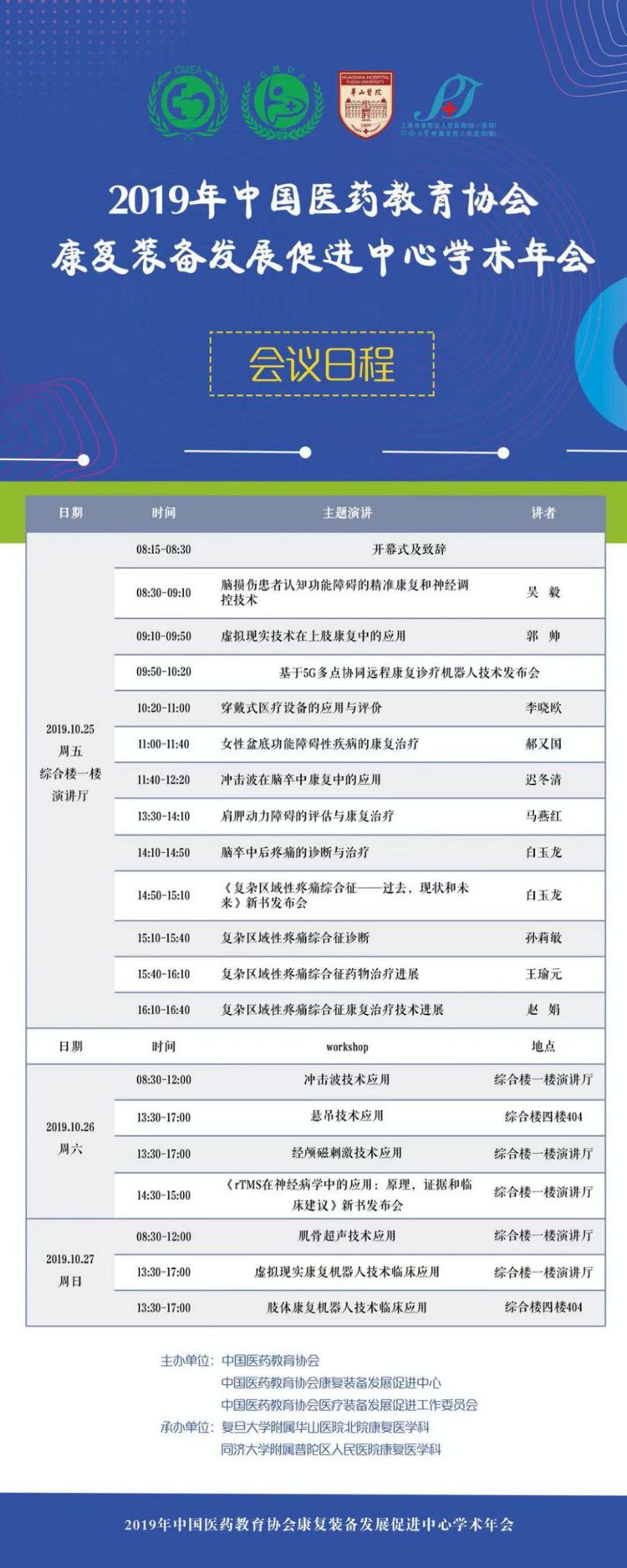 中国医药教育协会康复发展促进中心的"第一届学术年会"于2019年10月25-27日在上海的复旦大学附属华山医院北院综合楼一楼演播厅举办。