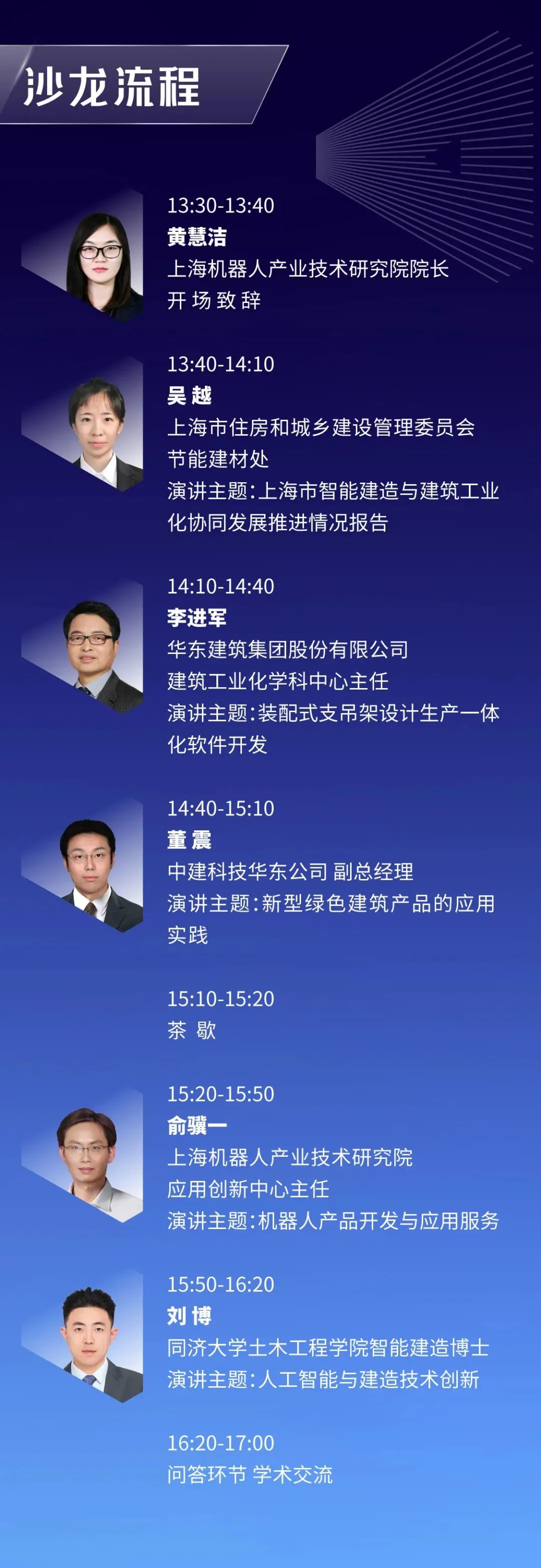 本次沙龙特邀上海市住房和城乡建设管理委员会节能建材处、leyu.乐鱼(中国)机器人有限公司官网、中建科技、华建集团、 同济大学土木工程学院五位大咖与大家深度分享智能建造技术与产业协同,产品与项目实践,创新与发展融合。
